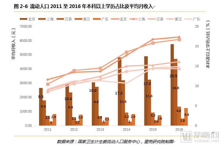 图表数据显示,从2011年开始至2016年,五大地区的流动人口整体的学历层次均逐年稳步提升,这里用“本科以上学历占比”来说明学历层次。其中位于北京地区的流动人口相对来说学历层次较高,本科占比高于全国其他地区,2016年更是高达20.5%,也就是说在北京的流动人口中超过五分之一的人是本科以上学历;紧追其后的是上海地区的流动人口,本科占比也处于较高位次,从2011年的占比6.4%提升至2016年的16.8%,另外统计的江苏、浙江、广东等经济发达地区本科占比也逐年小幅上升。这反映出流动人口中整体文化程度有上升趋势,不再局限于大家眼中的“农民工”,更多的高学历人才毕业后也选择远离家乡去就业机会更多的大城市就业发展乃至定居扎根。