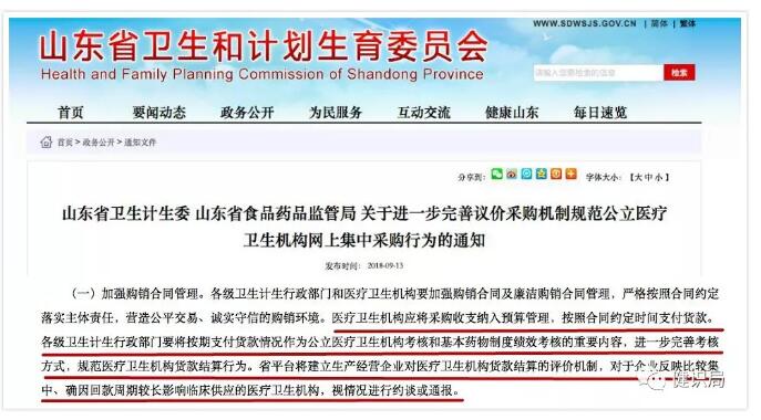 近日,山东省卫计委发布文件,要求医疗卫生机构将采购收支纳入预算管理,按照合同约定时间支付货款。对企业反映比较集中,确因回款周期较长影响临床供应的医疗卫生机构,视情况进行约谈和通报。