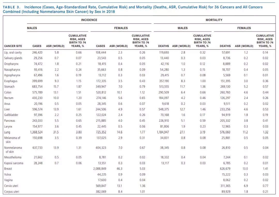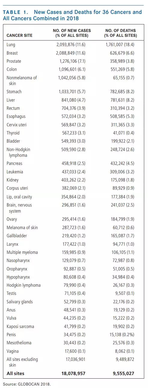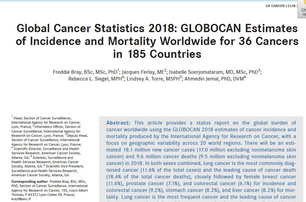 近日,世界上发行量最大的肿瘤学术期刊,也是影响因子最高的期刊之一《A Cancer Journal for Clinicians》发布了一篇题为“Global Cancer Statistics 2018: GLOBOCAN Estimates of Incidence and Mortality Worldwide for 36 Cancers in 185 Countries”的文章,即2018年最新的全球肿瘤统计分析结果,该文章一经刊出立即引起广泛关注,据了解,该统计分析覆盖了185个国家、36种癌症,其主要分析了2018年各癌症的发病率和致死率,并就各地区肿瘤的发病情况进行了详尽的说明。
