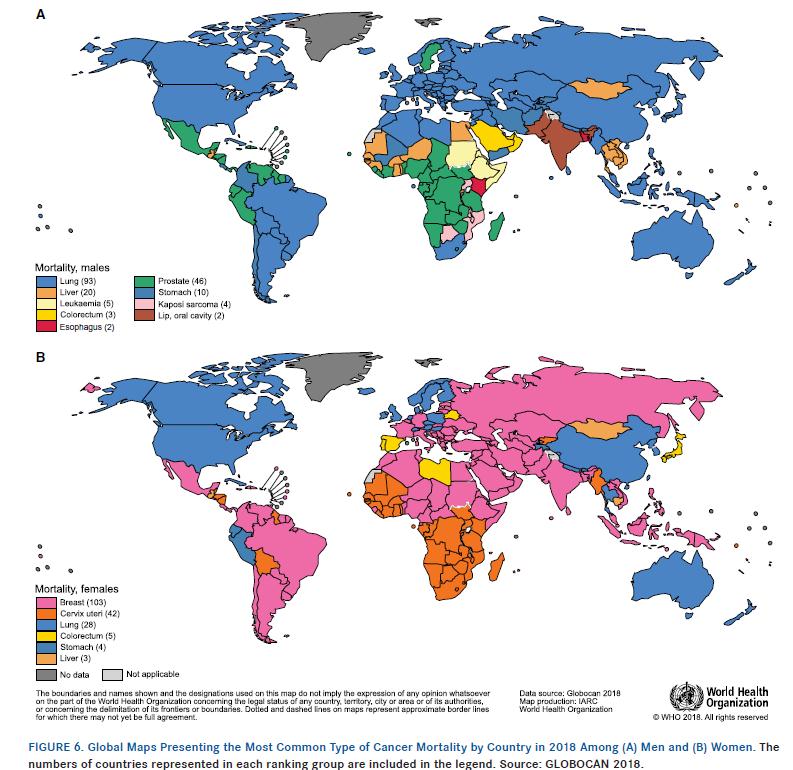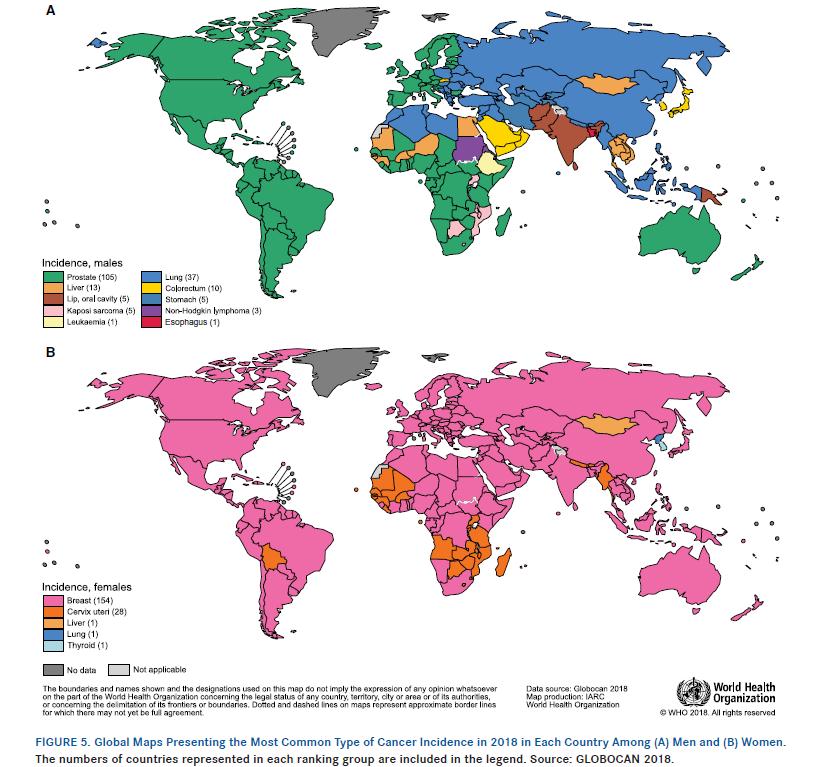 值得一提的是,上述研究最为重要的立意之一是将各地区经济发展程度和相关的社会生活方式纳入参考范围内。由于全球经济技术等因素的分布不均,导致各国各地区癌症的发病类型、发病情况、致死类型和死亡情况呈现分布不均的情况。根据最新癌症的流行病学分析发现,癌症的发病率与致死率与社会经济发展水平密切相关。
