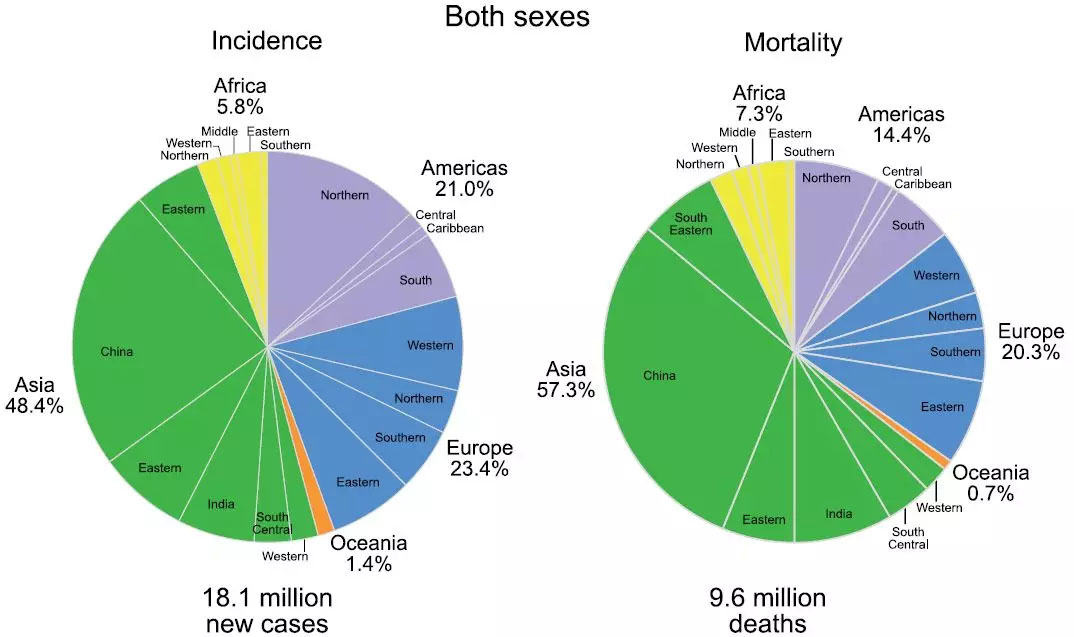 新增1810万癌症病例中,亚洲占据近一半。当然,这主要是由于近60%人群居住在亚洲。960万癌症死亡患者中,亚洲占近七成。