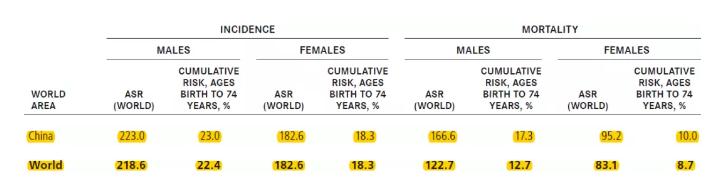 从两性的整体癌症发病率来讲,男性要高于女性(年龄标化率(ASR):218.6/10万 vs 182.6/10万),同样,男性的癌症死亡率也要高于女性(122.7/10万 vs 83.1/10万)。