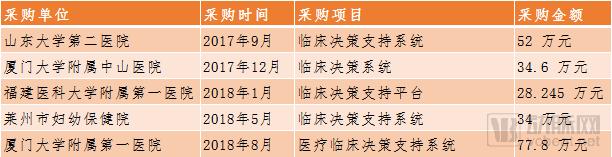 在中国政府采购网的招标数据中,我们查到了2017年到2018年部分医院临床决策支持系统的产品价格,具体如下图。根据估算,CDSS在国内的平均单价约为45万元。