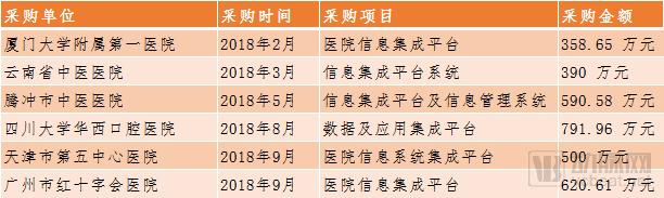 同样,我们在中国政府采购网的招标数据中,查阅了2018年部分医院集成平台的产品价格,具体如下图。我们估算,集成平台在国内的平均单价约为540万元。