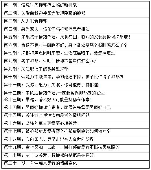 “士代阳光--中国心身医学教育联盟抑郁讲堂”项目覆盖北京、南京、上海、杭州、广州、深圳、重庆、成都等共计8个城市,每场讲座邀请3-4位心身医学权威专家,用20分钟左右的时间,围绕心身健康相关知识、心身疾病的预防和治疗知识进行疾病知识普及。今年已经进行了21期精彩在线科普讲座(主题如下表,2018年全年共计划推出32期),从学生、职场人士到老年人群,推动患者了解心身疾病知识,及早就医、科学就医,学会自我管理,提高大众的心身健康意识,提升心身健康素养。