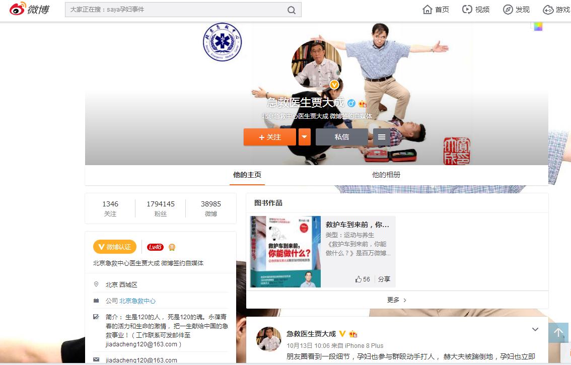 贾大成被称为“中国急救第一人”,其从事了近50年的急救工作,他给近3000家单位、超50万人进行过急救知识科普,他一次的急救知识科普网络直播观众就能达到上百万人,他在微博拥有近180万的粉丝,他从博客、微博到微信、微信公众号都致力于急救知识的传播,也被称为“抢救大王”、“急救科普大使”。