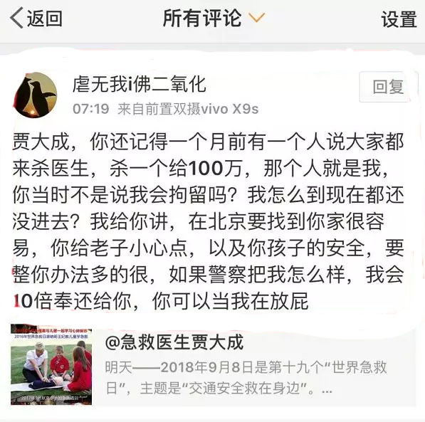 根据医学界的报道显示,此次向贾大成发出人身威胁的是一位“虐无我i佛二氧化”的用户,其在微博里嚣张直言:贾大成,你还记得一个月前一个人说大家都来杀医生,杀一个给100万,那个人就是我,你当时不是说我会拘留吗?我怎么倒现在都还没进去?我给你将,在北京要找到你家很容易,你给老子小心点,以及你孩子的安全,要整你的办法多的很,如果警察把我怎么样,我会10倍奉还给你,你可以当我在放屁。
