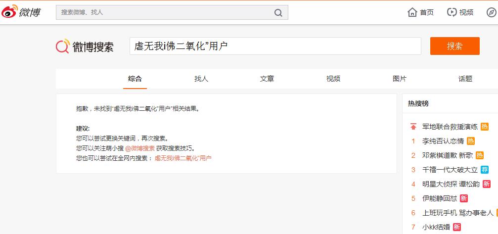 今日,医谷小编在新浪微博搜索“虐无我i佛二氧化”用户的相关结果,搜索结果显示未找到“虐无我i佛二氧化”用户“相关结果,有可能此用户已经注销账号或改名。