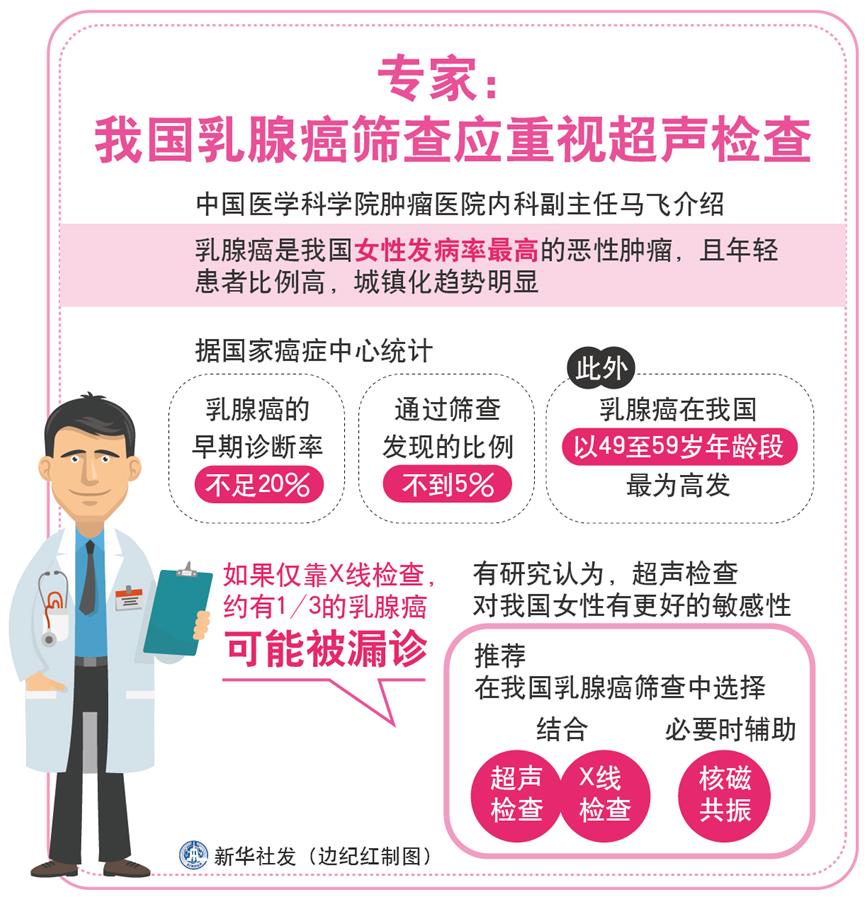 参与制定指南的中国医学科学院肿瘤医院内科副主任马飞介绍,国际指南对乳腺癌筛查普遍首推X线检查,而X线检查对致密型乳房的敏感度相对较低。对于我国女性而言,如果仅靠X线检查,约有1/3的乳腺癌可能被漏诊。有研究认为,超声检查对我国女性有更好的敏感性。因此,推荐在我国乳腺癌筛查中选择超声检查结合X线检查,必要时辅助核磁共振。