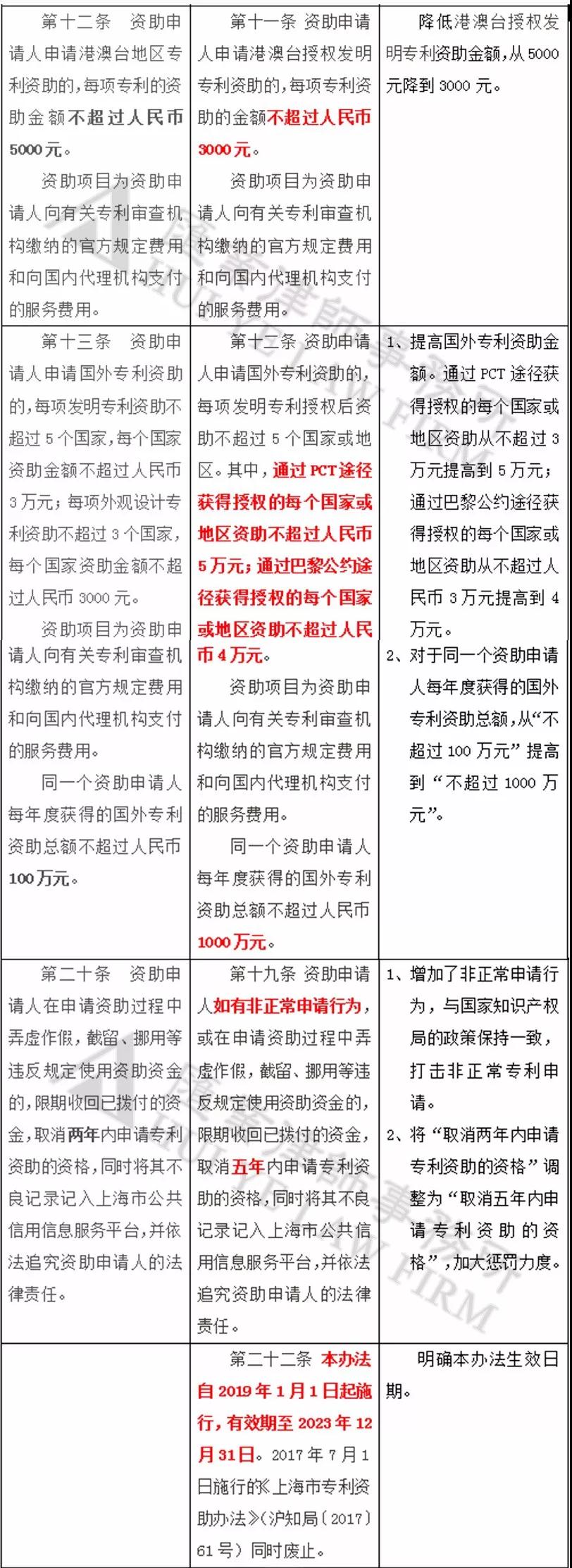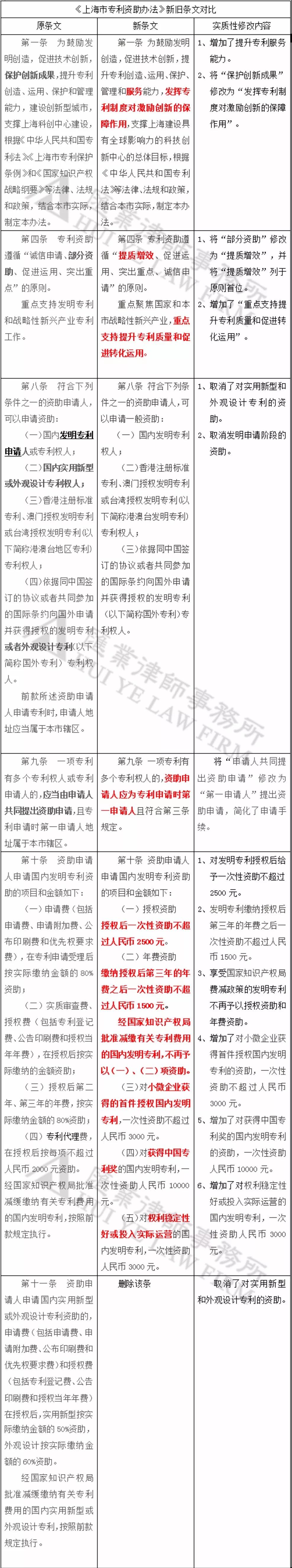 最近,上海市知识产权局公布了新修订的《上海市专利资助办法》,新办法加大了对高质量专利的扶持力度,并鼓励专利“走出去”,简化手续,方便资助申请。笔者整理了《上海市专利资助办法》新旧条文对照表,并简略分析其中的实质性修改内容,具体如下: