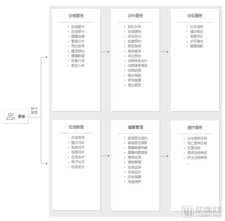 在这种合作模式里,腾讯云究竟能提供哪些技术支持?动脉网在查阅了腾讯云的官方资料后,发现主要由智慧医疗云、智慧就医等服务组成。其中智慧就医服务包含的内容如下:
