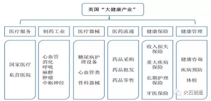 英国没有明确的“大健康产业”的概念,比较接近的名称是“健康服务业”。根据英国的实际情况,可以把英国的大健康产业归纳为以国家医疗服务保障体系为主体,涵盖药品和医疗器械研发/生产、医药流通、商业健康保险、健康管理等内容的产业集合。