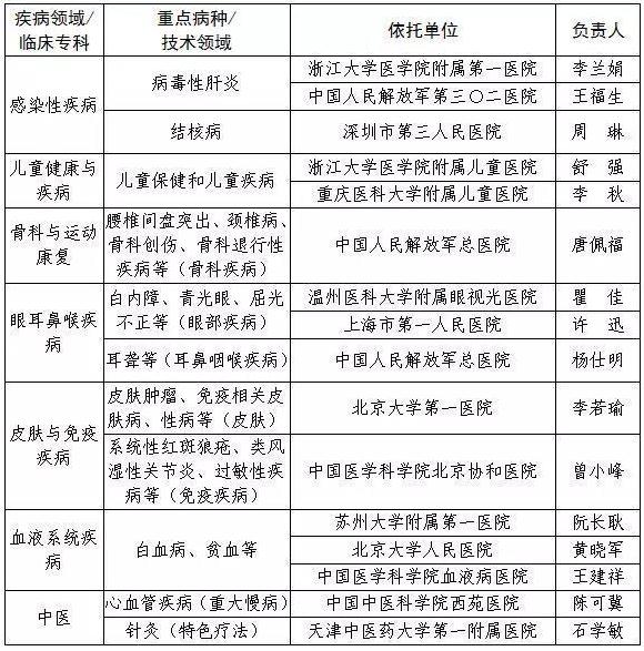 在这18家建设依托单位中,感染性疾病领域共3家,分别是浙江大学医学院附属第一医院、中国人民解放军第三O二医院、深圳市第三人民医院。儿童健康与疾病领域有2家,是浙江大学医学院附属儿童医院和重庆医科大学附属儿童医院。骨科与运动康复领域1家,定在中国人民解放军总医院。眼耳鼻喉疾病领域3家,分别是温州医科大学附属眼视光医院、上海市第一人民医院、中国人民解放军总医院。皮肤与免疫疾病领域2家,分别是北京大学第一医院和中国医学科学院北京协和医院。血液系统疾病领域3家,分别是苏州大学附属第一医院、北京大学人民医院、中国医学科学院血液病医院。中医领域2家,在中国中医科学院西苑医院和天津中医药大学第一附属医院;医学检验领域1家,在中国医科大学附属第一医院;放射与治疗领域1家,是复旦大学附属中山医院。