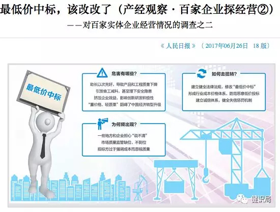 2017年,人民日报已撰文,直指最低价中标“三宗罪”——助长以次充好,导致产品和工程建设质量下降,优汰劣胜;极易引发偷工减料,甚至埋下安全隐患;影响企业创新研发的积极性。并称“以低价接单的企业,则只看重眼前利益,看似迫不得已的个体选择却在危害行业整体的健康发展”“不应延续”。