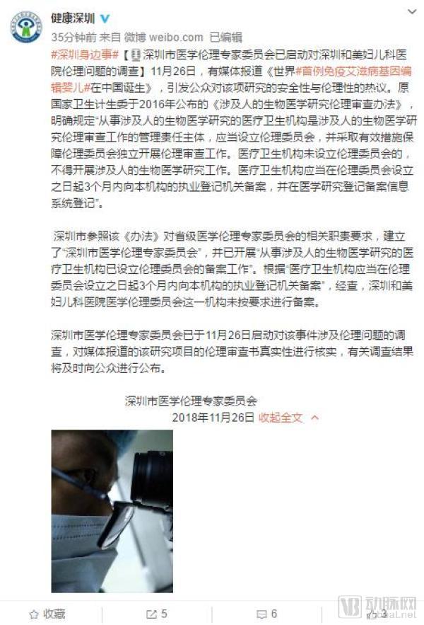 18点39分,深圳卫健委正式发表声明:已启动对和美妇儿科医院伦理问题调查。医学伦理专家委员会将对媒体报道的该研究项目的伦理审查书真实性进行核实,有关调查结果将及时向公众进行公布。