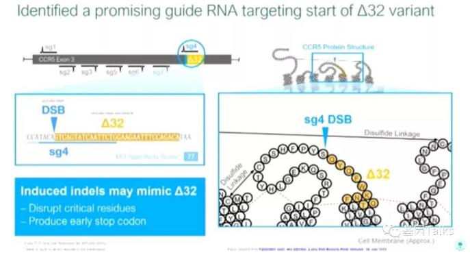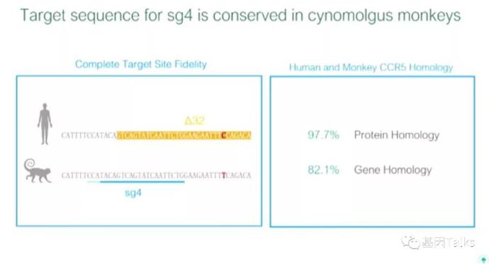 我们找到了一种非常具有潜力的向导RNA,它能造成CCR5基因的delta32变异。之前,同一个向导RNA曾用于多类细胞的测试,没有发现脱靶效应。其中,我们发现一个叫做sg4的向导RNA效率最高。它靶向的序列在猴子与人之间都是保守的。