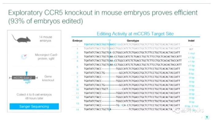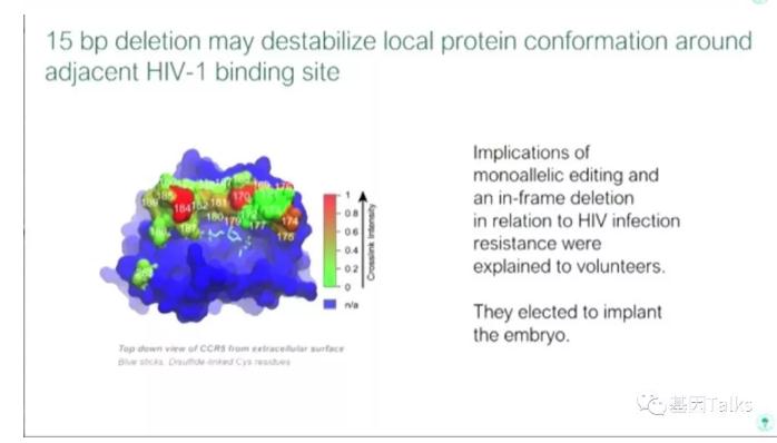 试验中,我们对胚囊进行了测序,结果表明一个胚囊出现了移码变异,CCR5蛋白更短;另一个胚囊出现了CCR5的部分删除,这个变异让CCR5蛋白变得不稳定,能减弱HIV的感染。