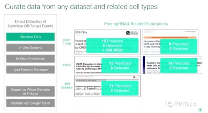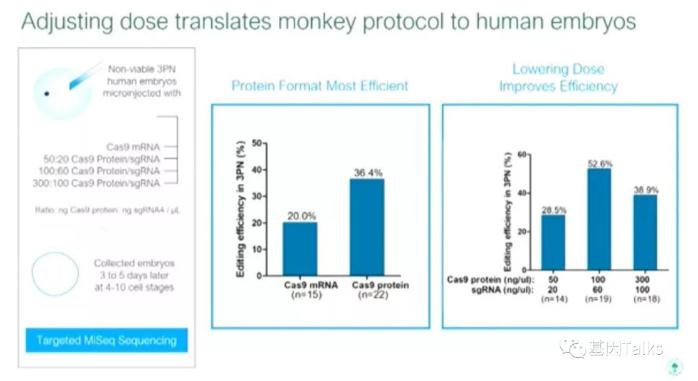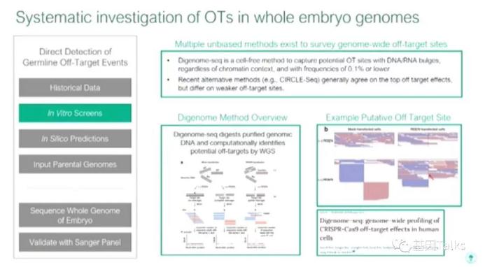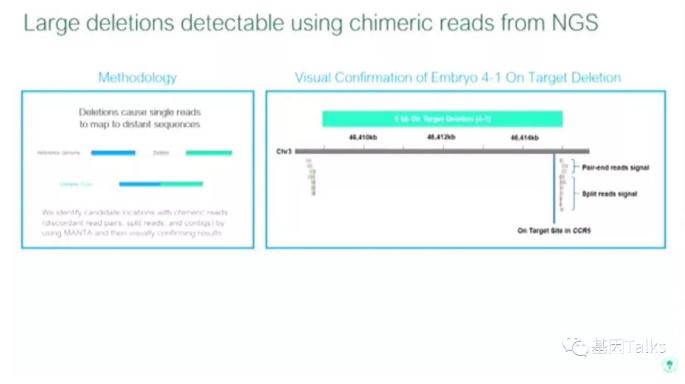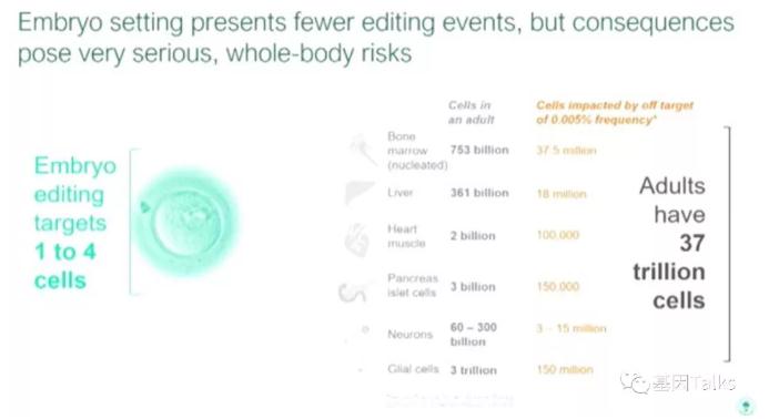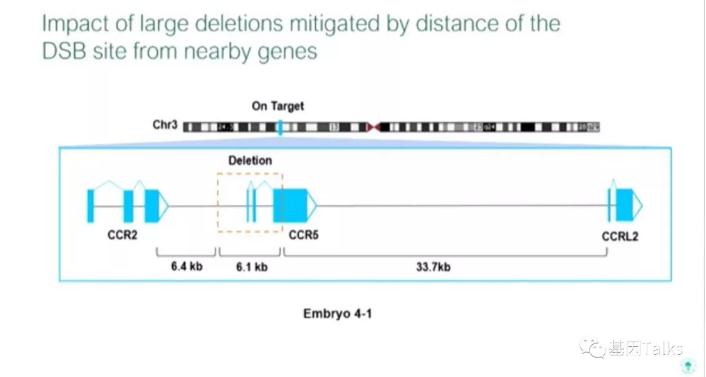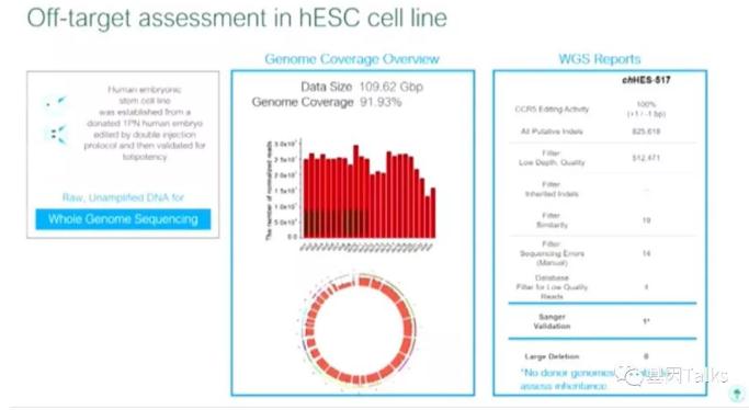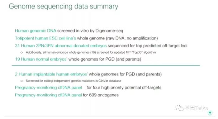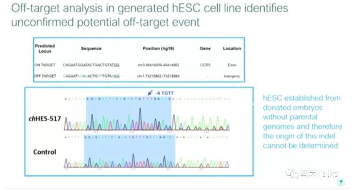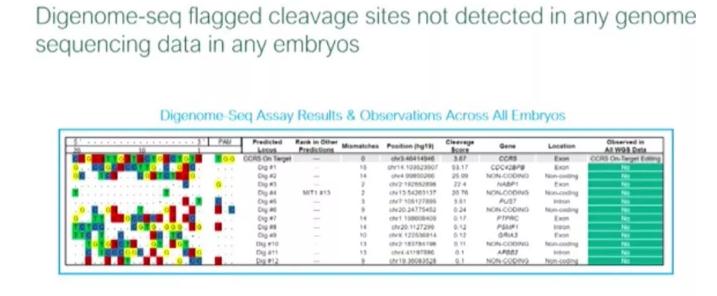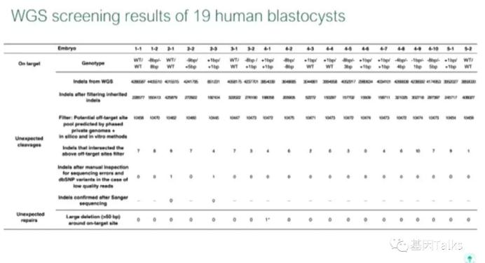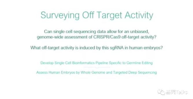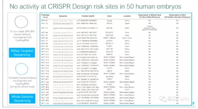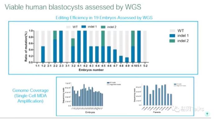 总体来讲,我们没有看到任何断裂位点,也没有在高风险脱靶位点附近看到编辑活性。对于人类胚胎干细胞系的测序则找到了一个潜在的脱靶效应,但我们不清楚这是由遗传导致的,还是由基因编辑导致的。在19个人类胚囊(blastocyst)里,全基因组测序也都没有观察到脱靶。