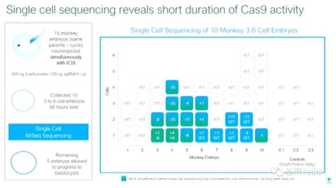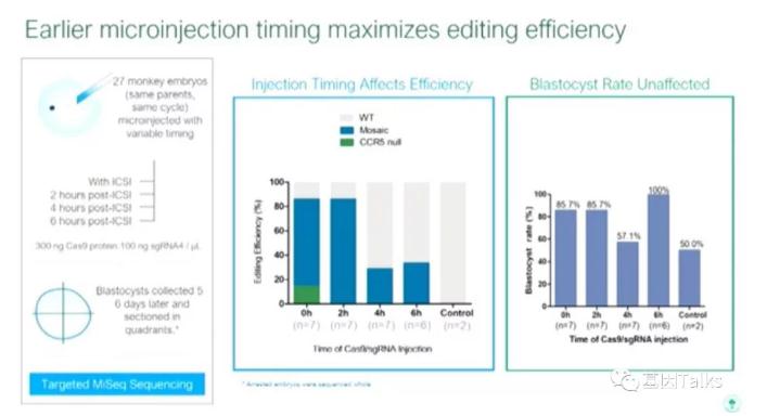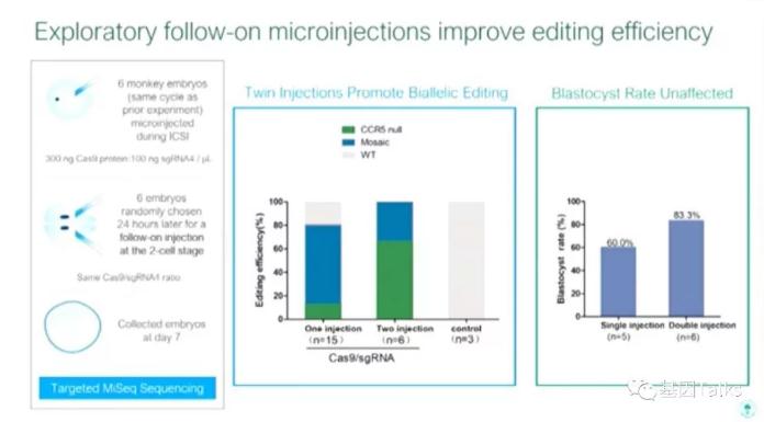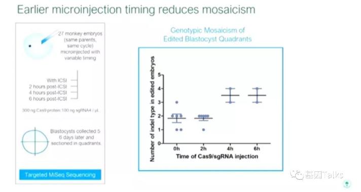 我们发现注射基因编辑的时机,会影响到编辑的效率。早期的微注射,能够减少嵌合(mosaicism)的发生。我们也发现Cas9蛋白在注射会后降解,因此设计了二次注射,对方法进行调整。