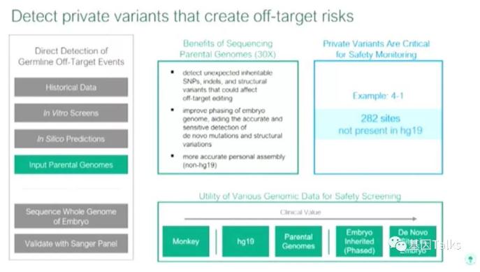 我们知道这项研究里,关键的安全性担忧在于脱靶。因为胚胎里只有1-4个细胞,所以任何脱靶效应,都会造成极为严重的全身性后果。因此我们对胚胎做了单细胞测序,并通过调整,减少测序的假阴性率;其次,我们还对父母的基因组进行测序作为比对,寻找由基因编辑带来的特定变异;第三,我们还测试了现有工具预测的高风险脱靶位点。