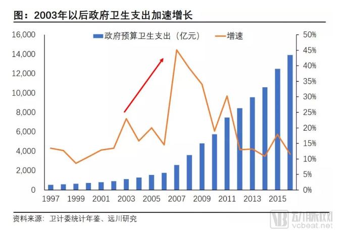 这只“黑天鹅”,给飞速发展的中国摁下了超过三个月的“暂停键”,让在朝在野的中国人蓦然发现:医疗卫生投入的长年欠账,已经成为整个社会发展的致命缺点。于是,加大对医疗的投入,成为举国上下的共识。在新政府的主导下,政府卫生支出从2003年开始骤然提升。