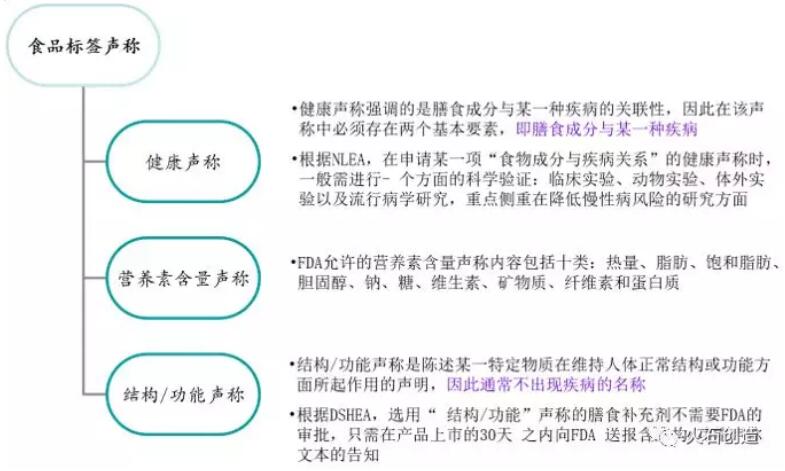 1938年美国国会颁布了《联邦食品、药品和化妆品法(FD&C Act)》,并在上世纪90年代相续出台了《营养标签与教育法(NLEA)》、 《膳食补充剂健康与教育法 (DSHEA)》,使得食品标识与健康声称的管理逐渐清楚、细化。根据美国法规,食品的标签声称可分为三类:健康声称、营养素含量声称以及结构/功能声称。