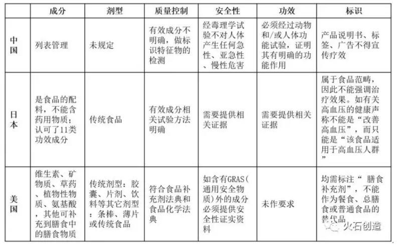 全球保健(功能)食品市场远没有成熟,各国的起步时间不同,中国保健食品与日本“特定用保健食品”、美国“膳食补充剂”在概念和要求上存在较大差异。