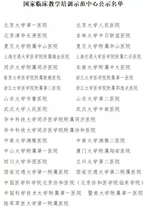 按照《国务院办公厅关于深化医教协同进一步推进医学教育改革与发展的意见》(国办发〔2017〕63号)、《教育部办公厅 国家卫生健康委办公厅关于开展国家临床教学培训示范中心建设工作的通知》(教高厅〔2018〕3号)精神与要求,经专家综合评定,认定74家高校附属医院(牵头医院)为首批国家临床教学培训示范中心,具体名单如下: