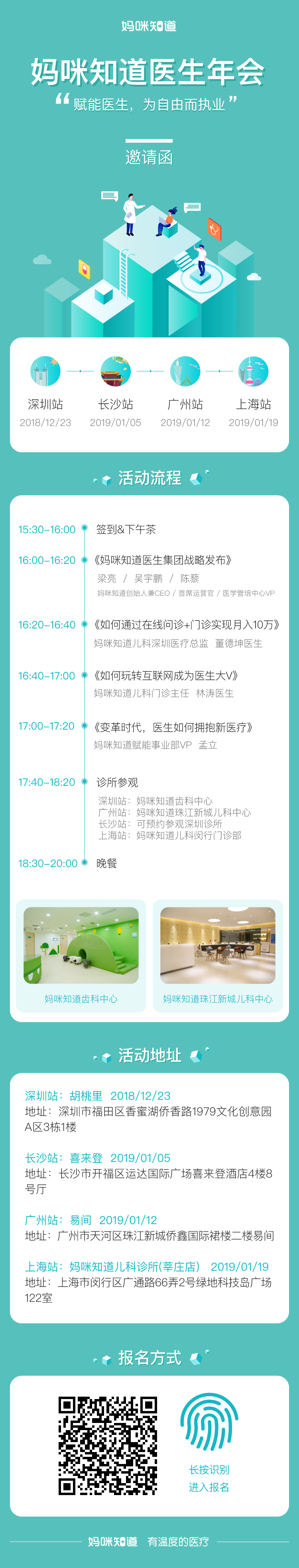 妈咪知道作为一个互联网+全国连锁私立儿科医疗机构,在实践过程中,也接触到很多医生有类似的困惑和咨询,因此特邀请走出体制投身私立诊所的先行者、行业资深管理者,在深圳、广州、长沙、上海四地举行医生年会,为广大儿科医生分享成长经验,共同探讨自由执业的模式和路径,妈咪知道诚邀您的参与!