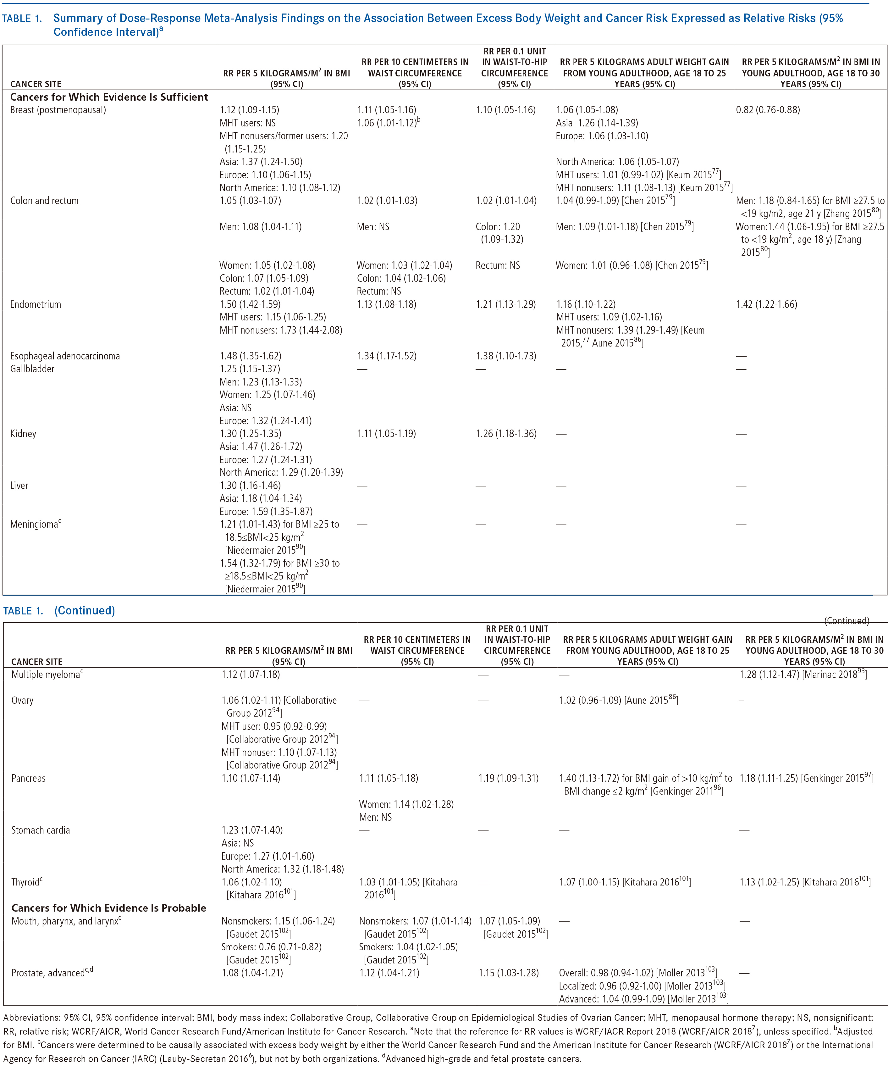 表1总结了目前流行病学的证据,表明人体脂与15个不同癌症部位的风险之间存在关联。数据主要基于生活在高收入国家的欧洲裔人口。