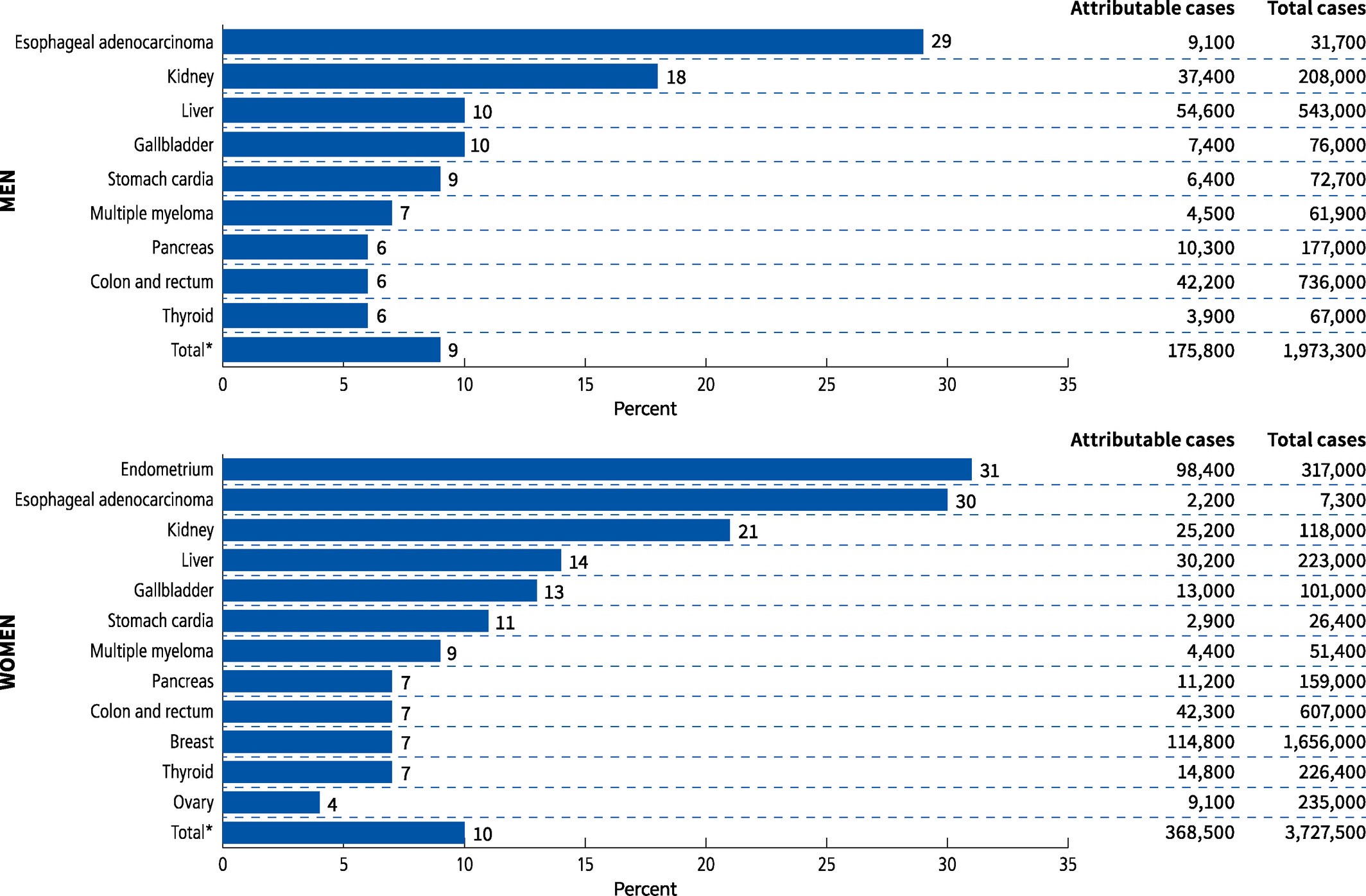 例如,女性超重大约导致了1/3的子宫内膜癌(31.7万例中的98,400例)和食管腺癌(7300例中的2200例),而对于卵巢癌(23.5万例中的9100例)的比例仅为4%。在男性中,约29%的食管腺癌可归因于体重超标,而胰腺癌、大肠癌或甲状腺癌则约为6%。