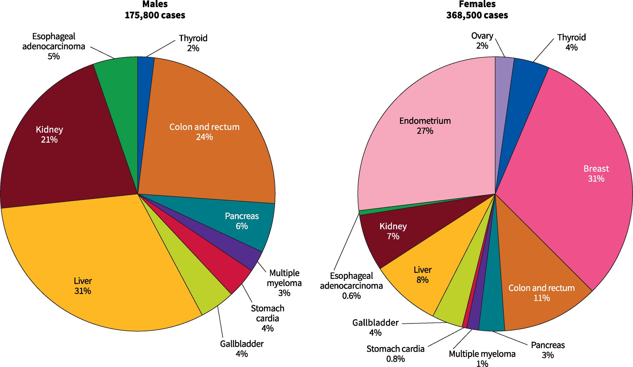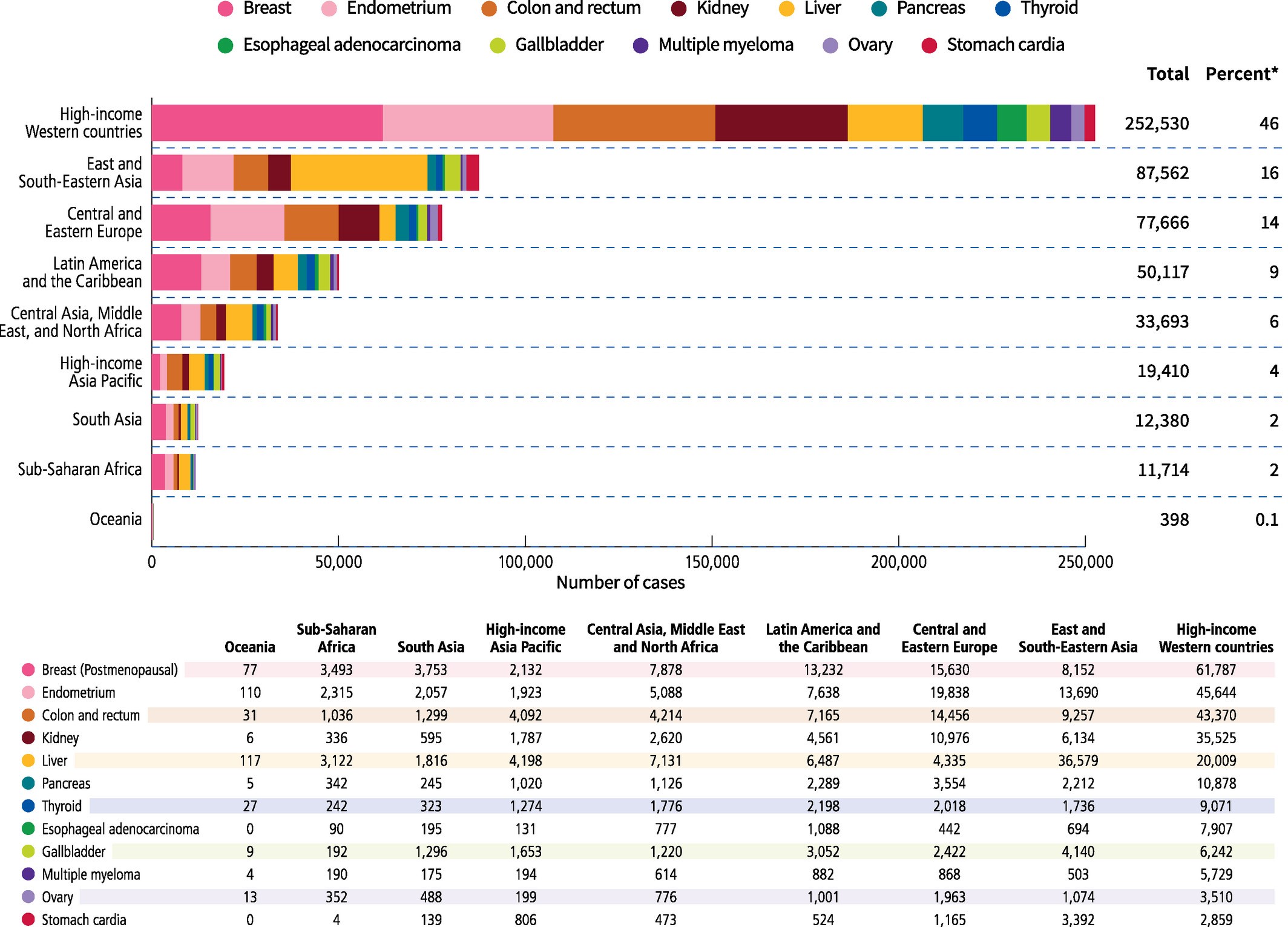 几乎一半由肥胖导致的癌症病例发生在高收入的西方国家(252,500例,46%),尽管超重率相对较低, 东部和东南亚地区因为其庞大的人口和肝癌的高负担排名第二(87600例,16%)。中欧和东欧排名第三(77,700例,14%),其次是拉丁美洲和加勒比地区(9%),中亚、中东和北非(6%)。