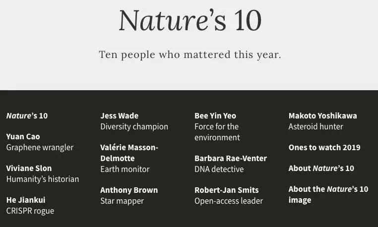 昨日(12月19日),《自然》杂志评选出了2018年最具影响力的十位科学家,其中,有三位生物医学领域的3位科学家入围,包括此前因为“世界首例基因编辑婴儿”事件在整个学界乃至全球掀起巨大争议的中国科学家贺建奎。