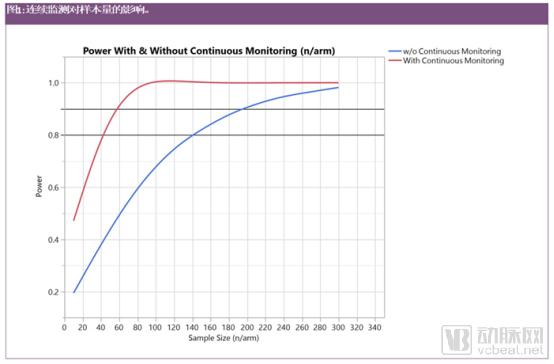 图1是关于帕金森病的一项临床研究,该研究与样本量以及是否持续监测有关。根据目前的UPDRS-III量表,在12个月的时间内,与患者日记等标准护理相比,超过300名患者(每只手臂150名患者)需要检测到疾病进展的放缓幅度大于40%。通过使用加速度计进行持续监测,大约有80名患者(每只手臂40名患者)达到预期结果的80%。