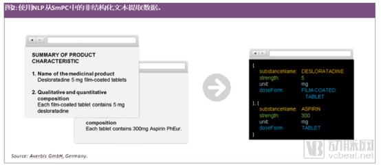 使用自然语言处理(NLP)进行文本挖掘的新工具为从文档中提取信息和数据以及随后自动上载到数据库中进行分析提供了新的可能性。现在已经有了基于人工智能的工具,可以从非结构化文本(如产品特性摘要)中提取数据来识别药品(IDMP)(如物质名称或强度)(见图2)。
