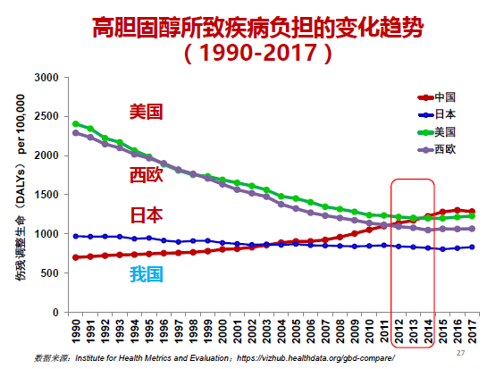该报告对比研究发现,过去20多年里,由高胆固醇所致疾病的负担,原本处于高位负担的美国、西欧一直在往下跑,提示负担在减轻;日本几乎是一条地平线——保持在相对稳定的低位,而我国原本处于负担的低位,从上世纪90年代开始缓慢增加。