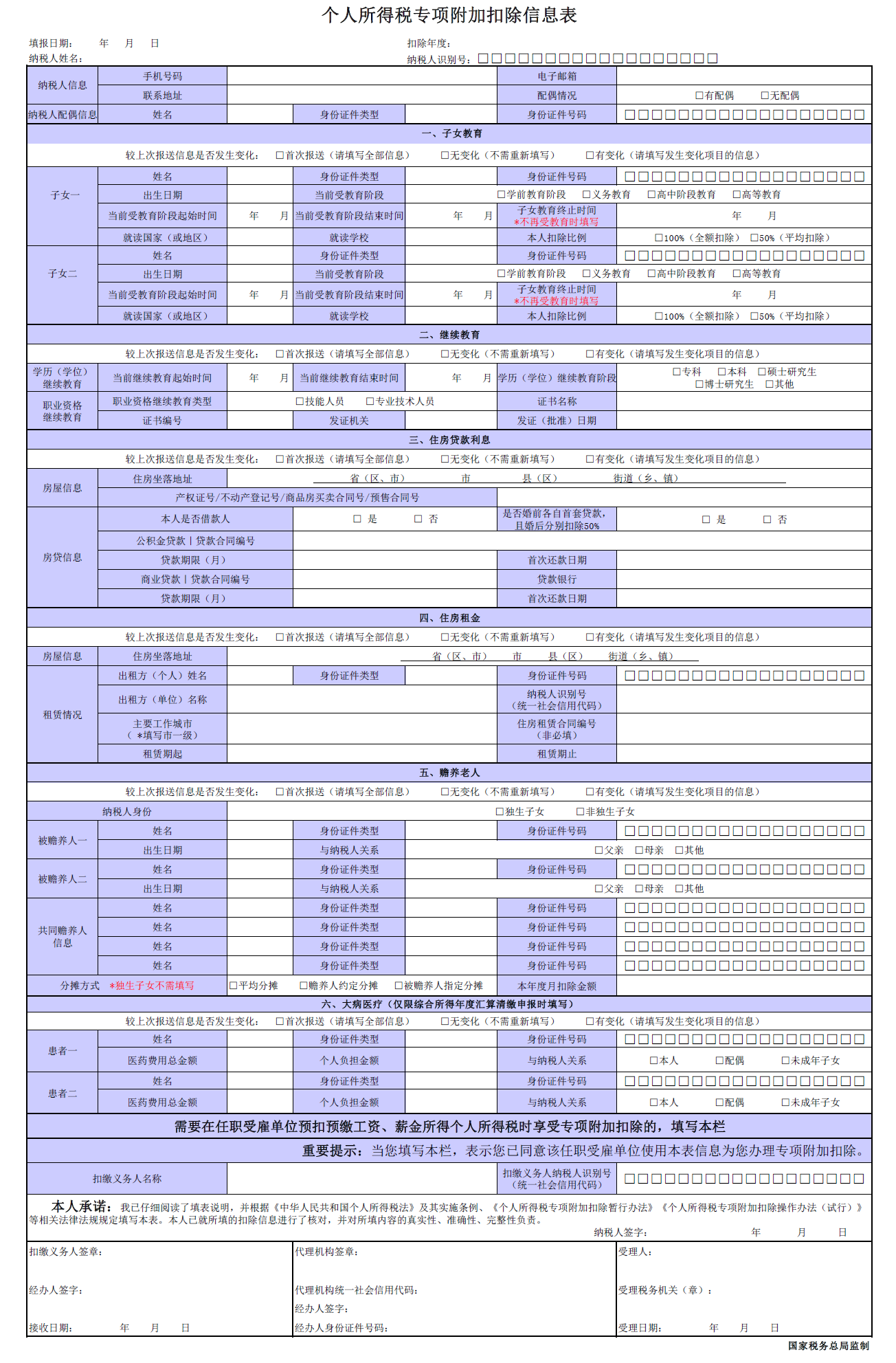 (一)本表适用于享受子女教育、继续教育、大病医疗、住房贷款利息或住房租金、赡养老人六项专项附加扣除的自然人纳税人填写。选择在工资、薪金所得预扣预缴个人所得税时享受的,纳税人填写后报送至扣缴义务人;选择在年度汇算清缴申报时享受专项附加扣除的,纳税人填写后报送至税务机关。