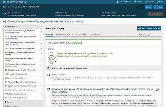 “医生来自不同的区域和不同的专业,比如我擅长乳腺病,那么我看乳腺的患者,10秒钟就会想出患者的治疗方案,因为我脑子里装着指南。但是假如一个患者同时肺癌,或者淋巴瘤,我手里有十个指南也来不及看,这个时候就可以借助Watson提供优先选择的医疗方案。”