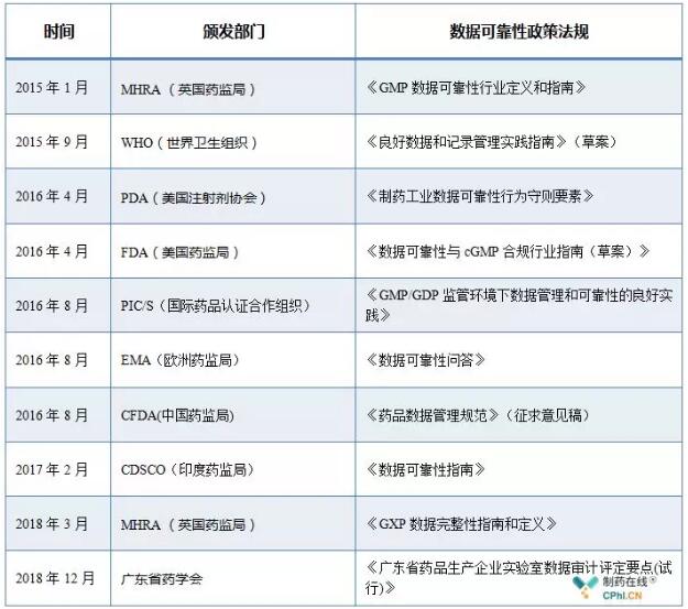 数据可靠性(Date integrity)是指在数据生命周期内,数据完整、一致、准确的程度。自2014年以来,包括中国、印度等多家API(原料药)生产企业被美国FDA发现存在数据可靠性问题,收到了警告信,数据可靠性也成为国内外药监部门检查的重点,在日趋严格和频繁的检查形势下,自2014年以来,全球各监管部门及行业协会陆续颁布并实施了一系列数据可靠性管理相关的指南。