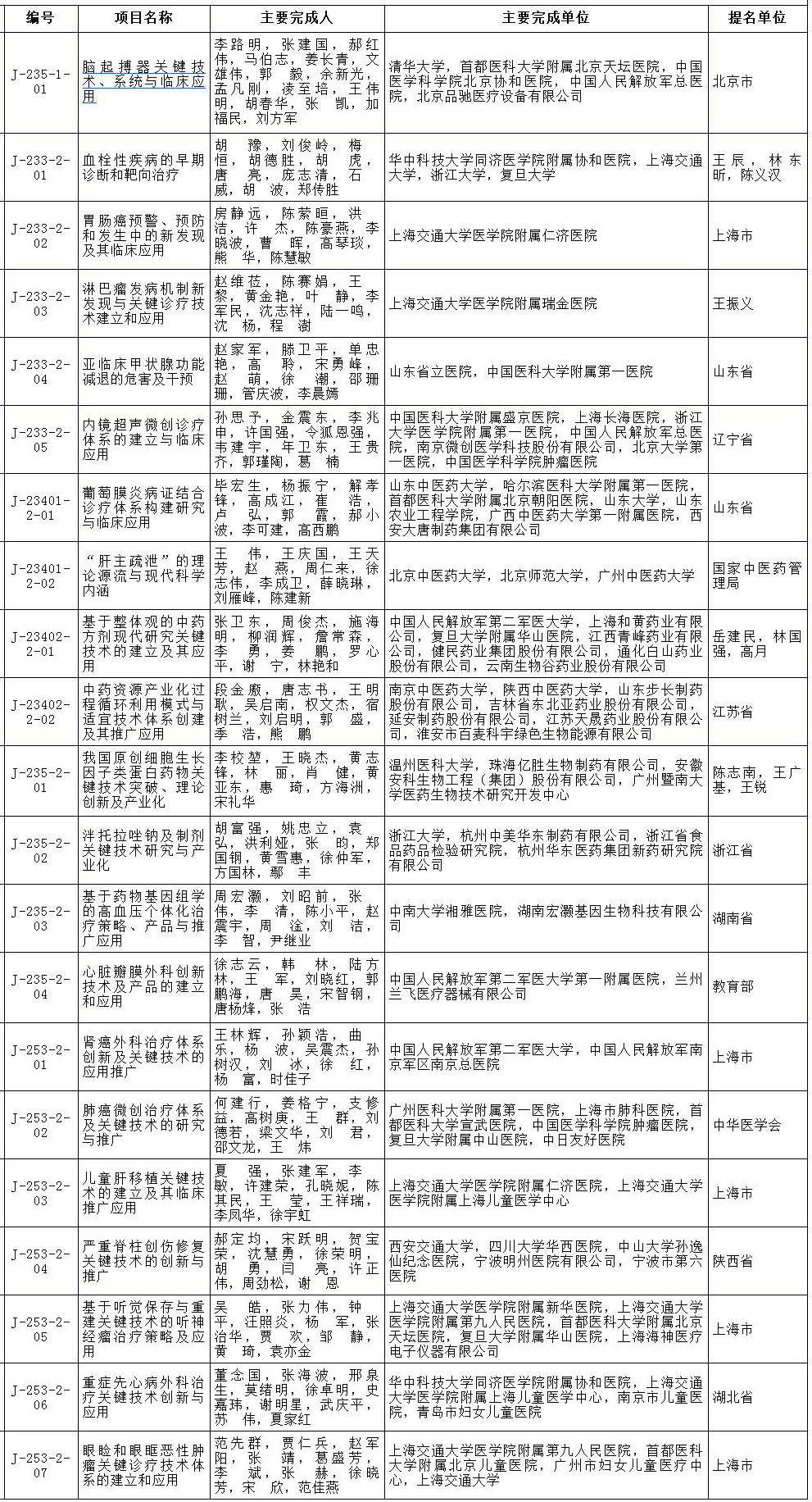 2018年度国家技术发明奖医学类获奖项目