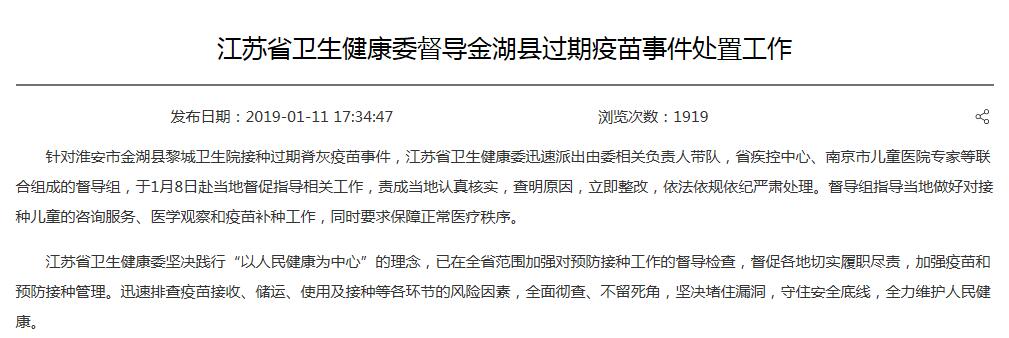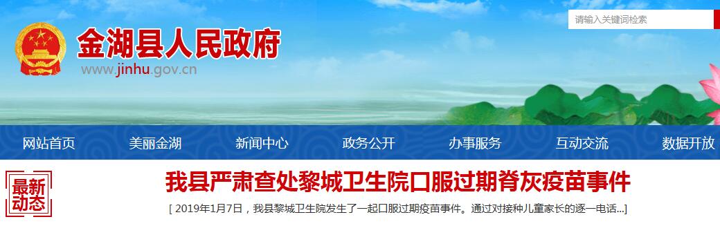 同日,金湖县人民政府官网发布了《我县严肃查处黎城卫生院口服过期脊灰疫苗事件》的消息,内容如下:
