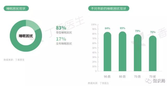 报告中显示,除了96%的公众表示自己存在健康相关的困扰之外,年轻人比老年人受到更加严重的睡眠问题困扰。84%的90后存在睡眠困扰,而70前的这一数字是76%。