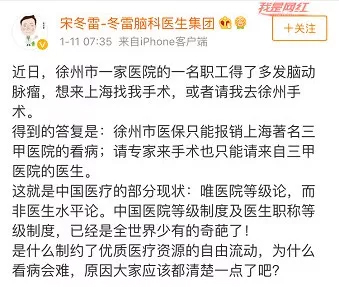11日上午,冬雷脑科医生集团创始人宋冬雷在微博上发了一则微博,抨击了中国医院等级制及医生职称等级制的“老问题”,同时吐槽了社会办医面临的残酷现状:如何接诊社保患者。
