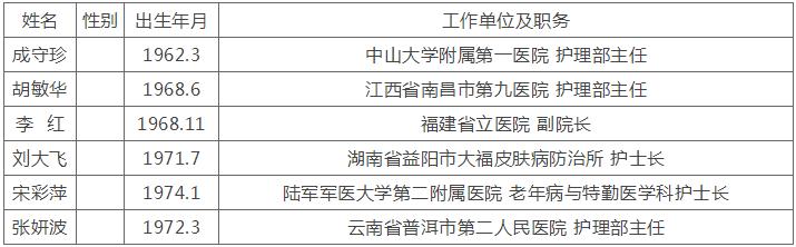 根据公示名单,此次南丁尔格奖拟推荐的候选人共有6位,分别为中山大学附属第一医院护理部主任成守珍、江西省南昌市第九医院护理部主任胡敏华、福建省立医院副院长李红、湖南省益阳市大福皮肤病防治所护士长刘大飞、陆军军医大学第二附属医院老年病与特勤医学科护士长宋彩萍、云南省普洱市第二人民医院护理部主任张妍波。