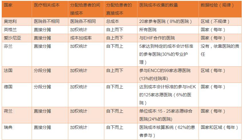 《DRGs in Europe》一书对欧洲八国DRG成本核算进行调查比较,比较结果如表1所示: