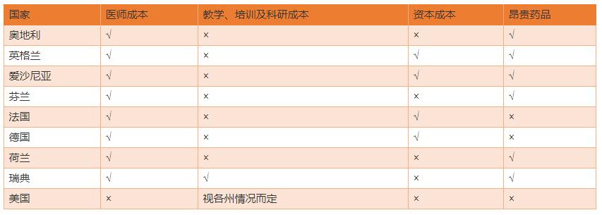 价格昂贵的药品(法国、德国、荷兰、波兰、瑞典)与耗材(法国、西班牙、瑞典)通常不适用DRG支付,教学与科研成本不在DRG支付范围内。奥地利、芬兰、德国、爱尔兰医院的资金成本及利息不包含在DRG支付范围内。德国、爱尔兰医院的债务津贴不包含在DRG支付范围内。