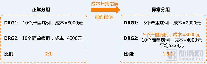 德国柏林工业大学&柏林理工大学的Thomas Mansky在2016年12月9日“首届国家疾病诊断相关分组(DRG)论坛”上的演讲 “德国医疗保险制度及DRG的应用”中提出:不当的成本数据会导致“压缩效应”,无法得到最细化的分组,并举例如下: