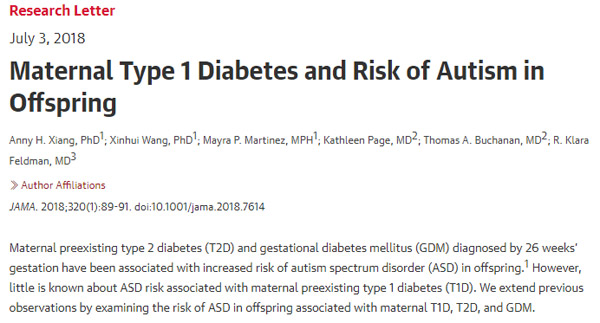 2018年6月,美国南卡罗来纳大学的Thomas Buchanan及其团队报道,在美国,孕妇患糖尿病与新生儿患自闭症的风险增加相关。Buchanan告诉《科学家》杂志,“糖尿病的严重程度和患病时间似乎不存在剂量-反应关系,但与自闭症存在关联:孕妇患糖尿病越严重和越早出现,儿童患自闭症的风险就越大。”
