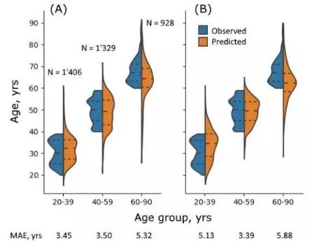 算法预测年龄与实际年龄对比示意图,其中蓝色为实际年龄,橘色为算法预测年龄(图片来源:bioRxiv)