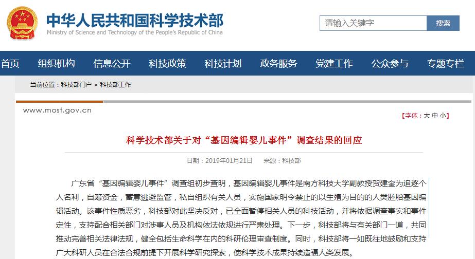 1月21日,科学技术部对“基因编辑婴儿事件”调查结果作出回应:广东省“基因编辑婴儿事件”调查组初步查明,基因编辑婴儿事件是南方科技大学副教授贺建奎为追逐个人名利,自筹资金,蓄意逃避监管,私自组织有关人员,实施国家明令禁止的以生殖为目的的人类胚胎基因编辑活动。该事件性质恶劣,科技部对此坚决反对,已全面暂停相关人员的科技活动,并将依据调查事实和事件定性,支持配合相关部门对涉事人员及机构依法依规进行严肃处理。下一步,科技部将与有关部门一道,共同推动完善相关法律法规,健全包括生命科学在内的科研伦理审查制度。同时,科技部将一如既往地鼓励和支持广大科研人员在合法合规前提下开展科学研究探索,使科学技术成果持续造福人类发展。